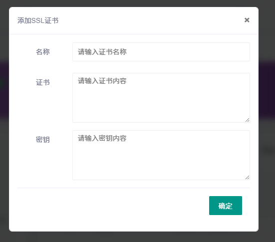 1.添加证书:如下方图片,填入您的证书和相关的名称就能够完成证书添加。如果在证书的添加过程中遇到超时等情况,请及时开工单或者联系管理员 347938669 进行排查修复。