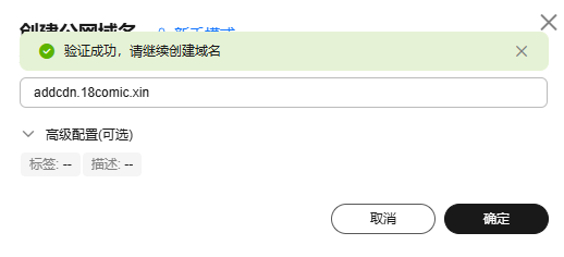 2.在完成验证后继续创建域名,以华为云为例