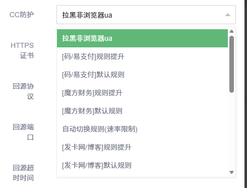 1.CC防护:如下图,CC防护是指在访问网站时默认的CC规则,如果你的站点不涉及API相关内容时,例如静态网页,使用JS验证。如果你的网站为下方提及的,例如博客,发卡网,魔方财务,易支付/码支付网站,请使用对应的默认规则组与提升规则组。这类规则已经针对性兼容过相关支付回调与API,确保在受到攻击开启人机验证时不影响相关业务的进行。