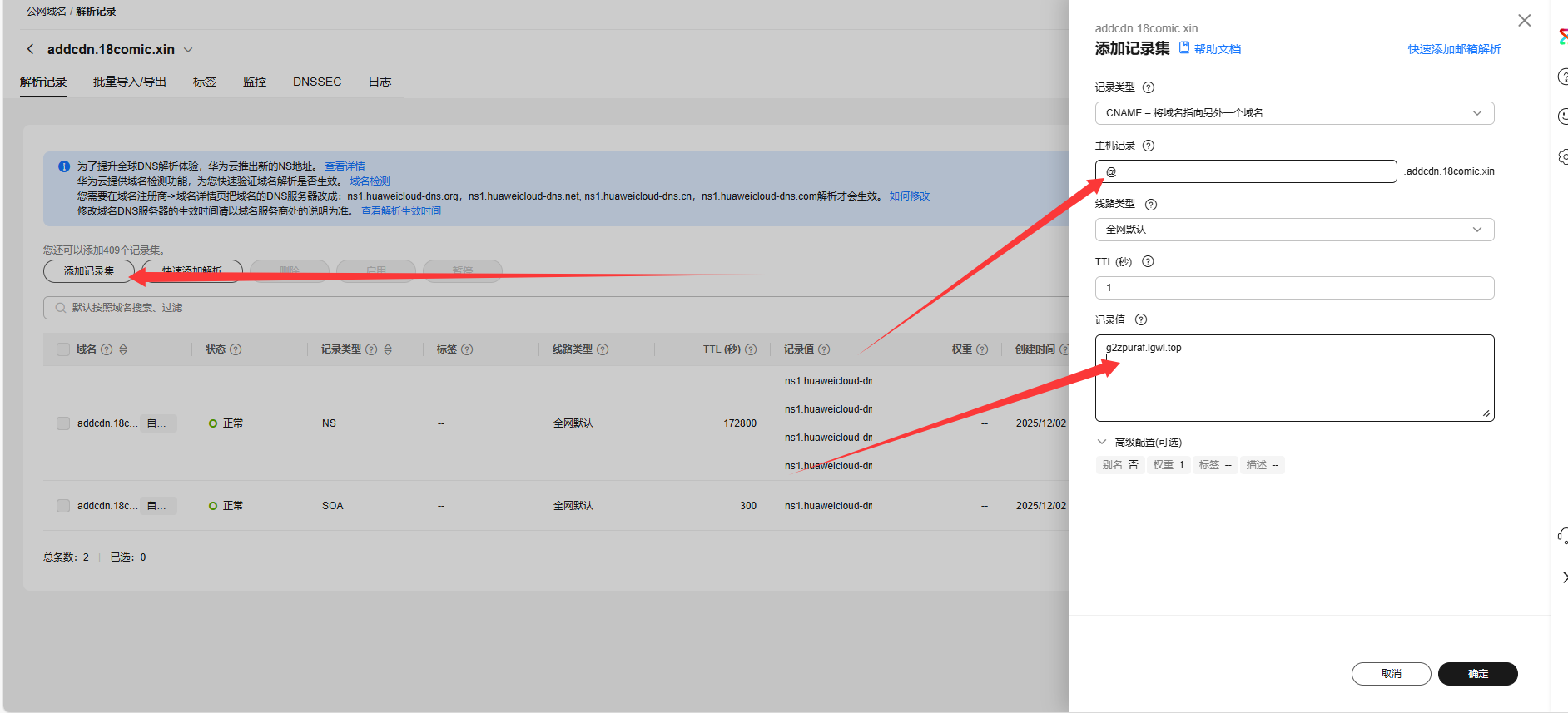 1.前往华为云[同样可以为阿里云,腾讯云]云解析控制台处,添加完整二级域名addcdn.18comic.xin ->跳转