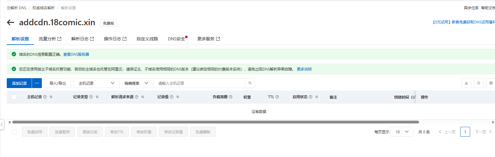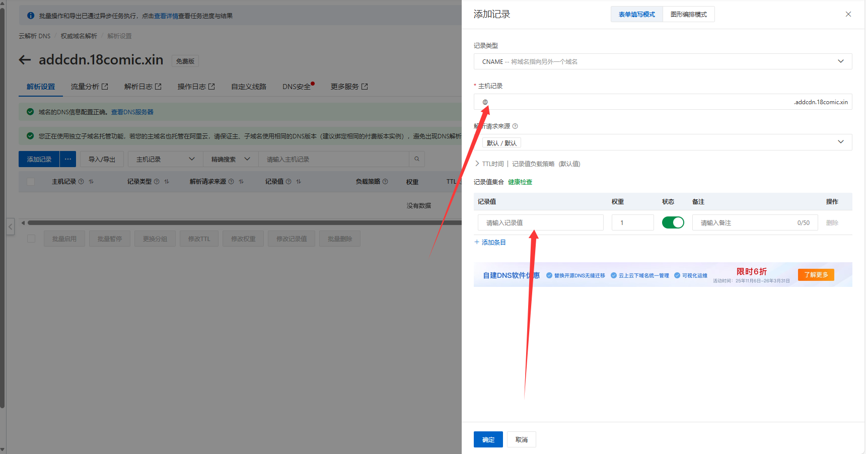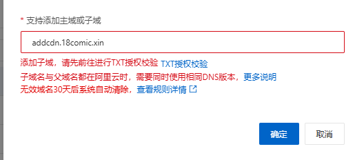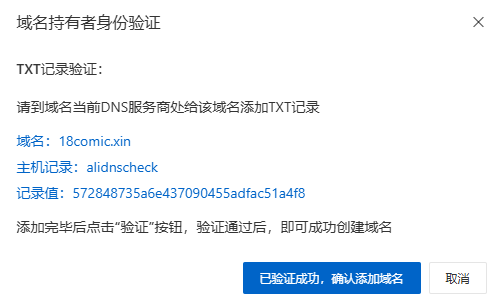 1.前往阿里云 云解析控制台,以addcdn.18comic.xin为例 添加域名完成TXT校验 ->跳转