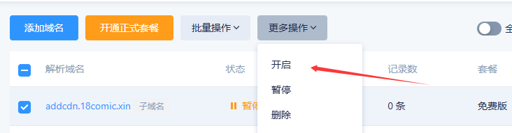 4.选择二级域名 开启解析,确保正常开启解析后即可正常添加二级域名的相关解析