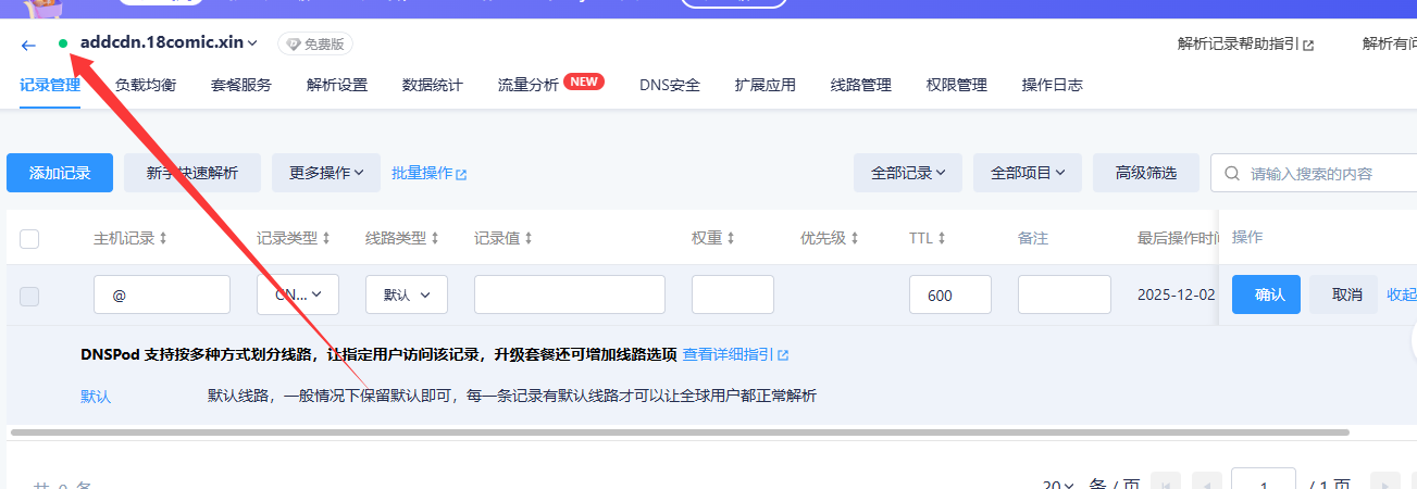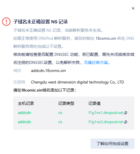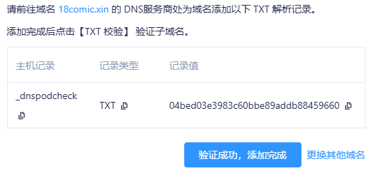 1.前往DNSPOD云解析控制台,以addcdn.18comic.xin为例 添加域名完成TXT校验 ->跳转