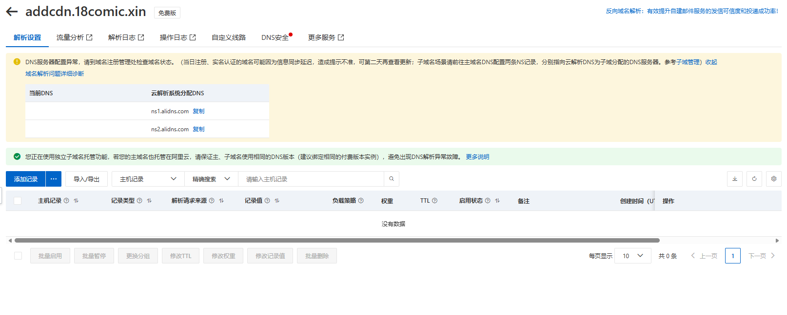 3.完成NS解析添加后 点击重新验证 并且刷新网页 待到该提示消失后即添加二级域名成功